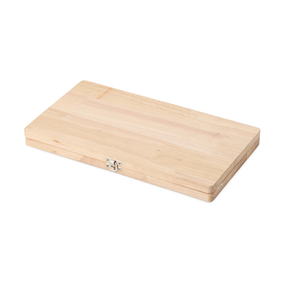 Kit churrasco 4 peças em estojo de madeira. Contém três facas e um garfo de inox com pegadores de madeira.