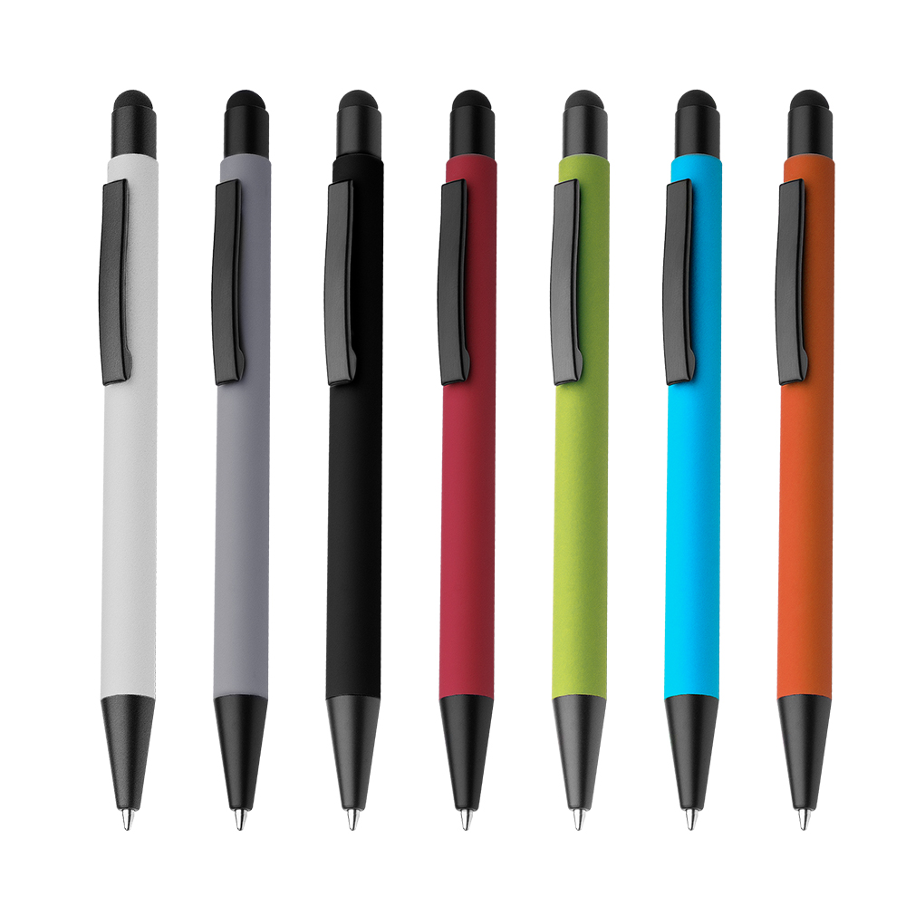 Caneta esferográfica em metal escrita em azul com corpo emborrachado. Refil tipo parker com ponta touch emborrachada.