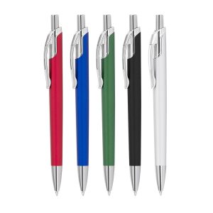 Caneta esferográfica em metal com escrita em azul, cor brilhosa e detalhe brilhoso em dourado rose.