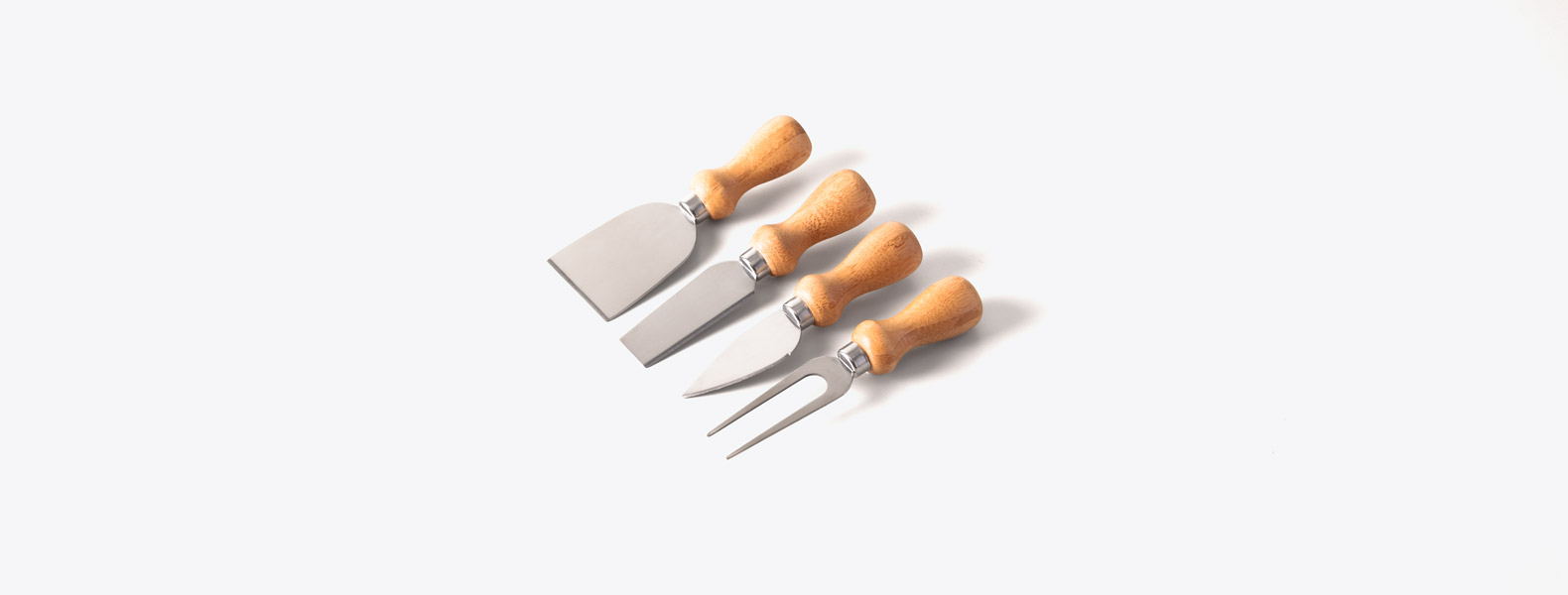 Conjunto para queijo. Composto por duas facas, sendo, uma com ponta e outra reta, garfo e espátula em madeira/inox.