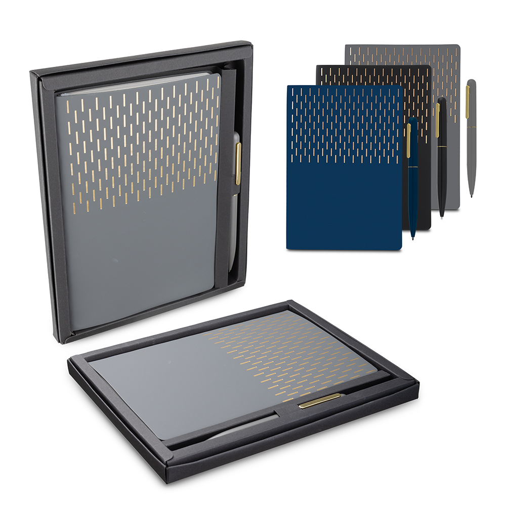 Conjunto composto por caderno com capa em PU com detalhe de gravação dourada, contendo 80 folhas pautadas em papel 70g/m²,…