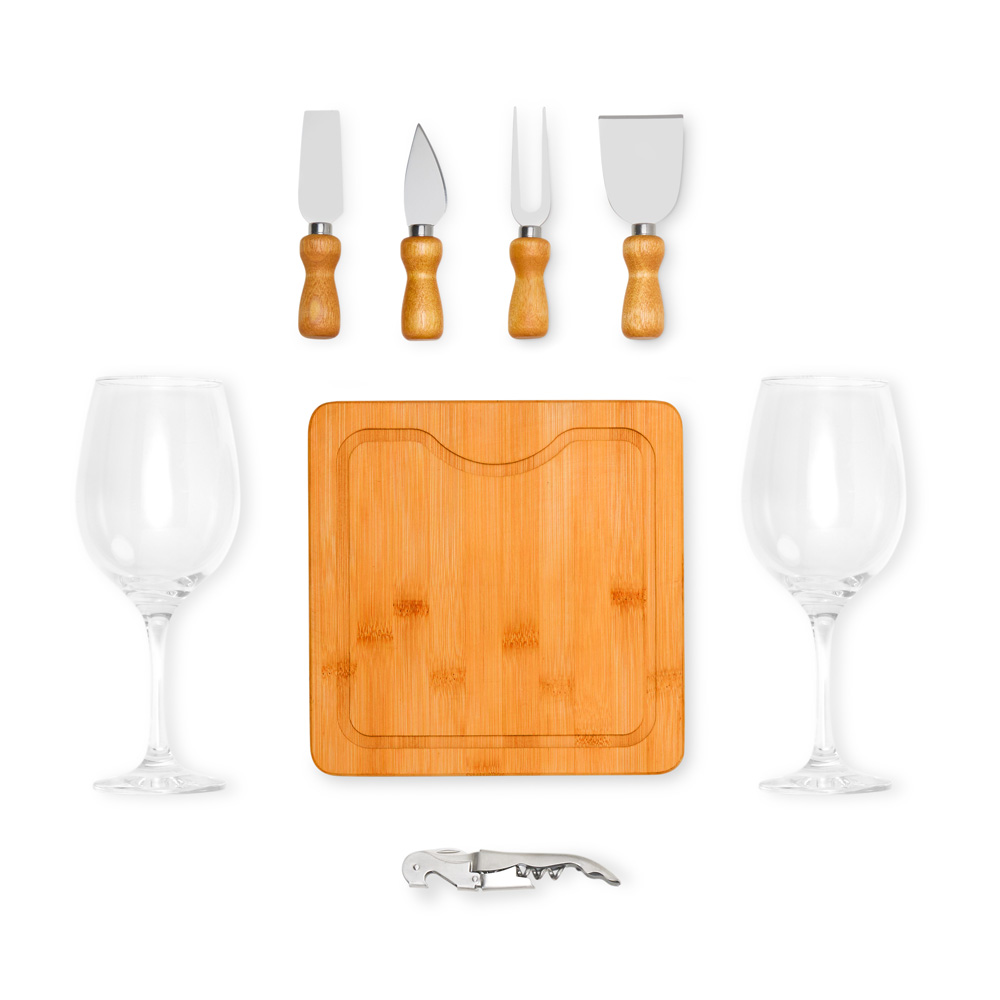 Composto por tábua em Bambu quadrada para Queijo/Petisco; duas facas, sendo, uma com ponta e outra reta, garfo e espátula em Madeira/Inox; duas taças em vidro para Vinho e abridor saca-rolhas em aço Inox escovado.