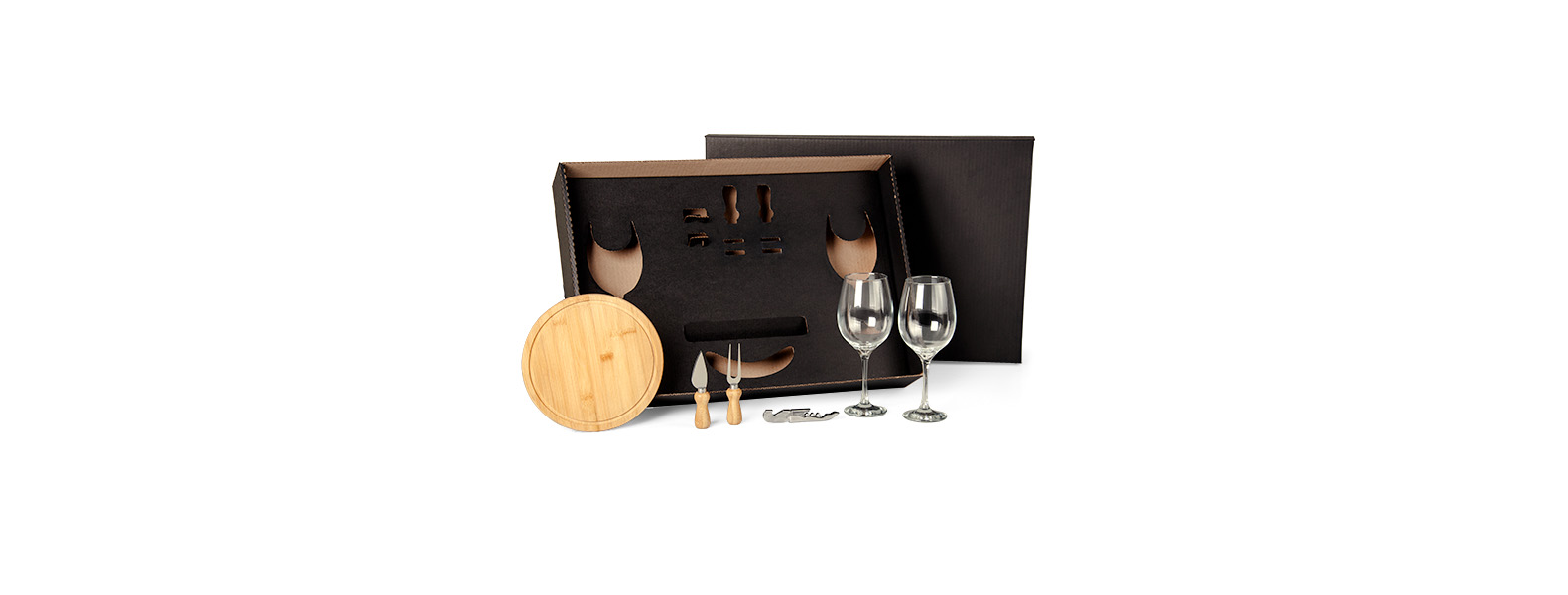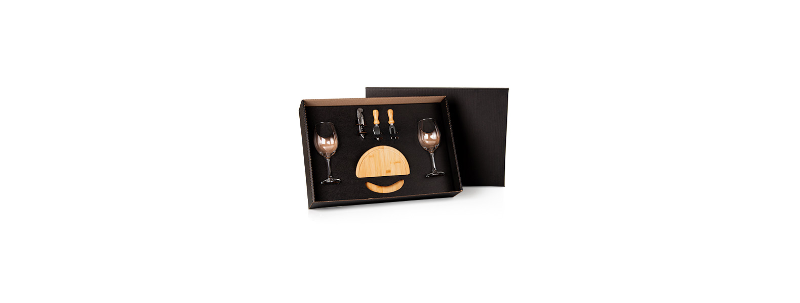 Kit para Queijo e Vinho. Conta com tábua para Queijo/Petiscos em Bambu; duas facas, sendo, uma com ponta e outra reta, garfo e espátula em Madeira/Inox; duas taças para vinho em vidro e abridor em metal. Estão perfeitamente acomodados em uma caixa para presentear.