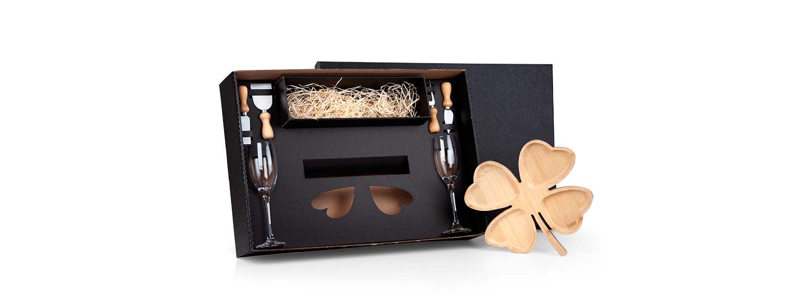 Conta com petisqueira formato de trevo em bambu; Duas facas, uma espátula e um garfo para queijo em madeira/inox; Duas taças para champanhe em vidro; Espaço para garrafa com palha (NÃO ACOMPANHA GARRAFA). Estão perfeitamente acomodados em uma caixa para presentear.