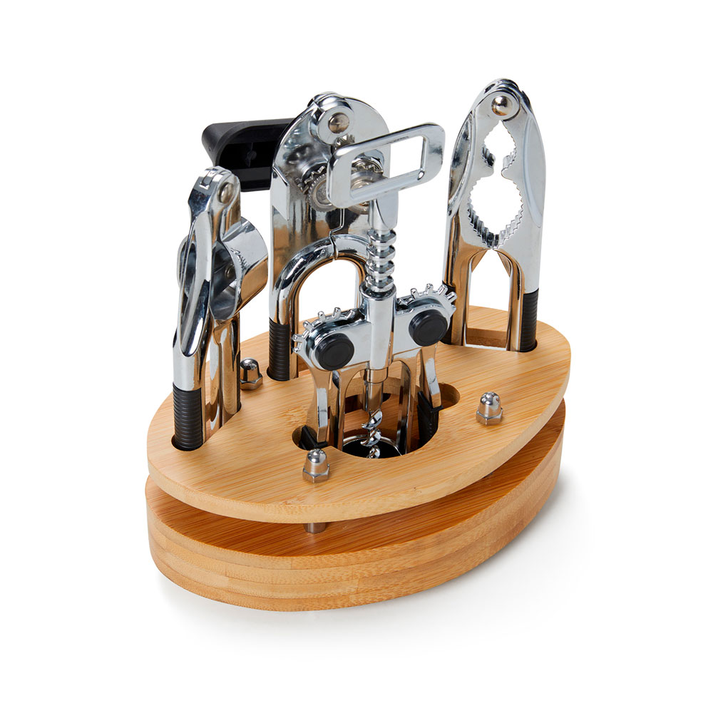 Kit com quatro acessórios úteis para cozinha em metal cromado brilhante com detalhes em plástico texturizado preto nos cabos, sendo um abridor de latas borboleta, um espremedor de alhos, um alicate quebra-nozes, um saca-rolhas de alavanca dupla com espiral e taças de 490 ml para vinho.
