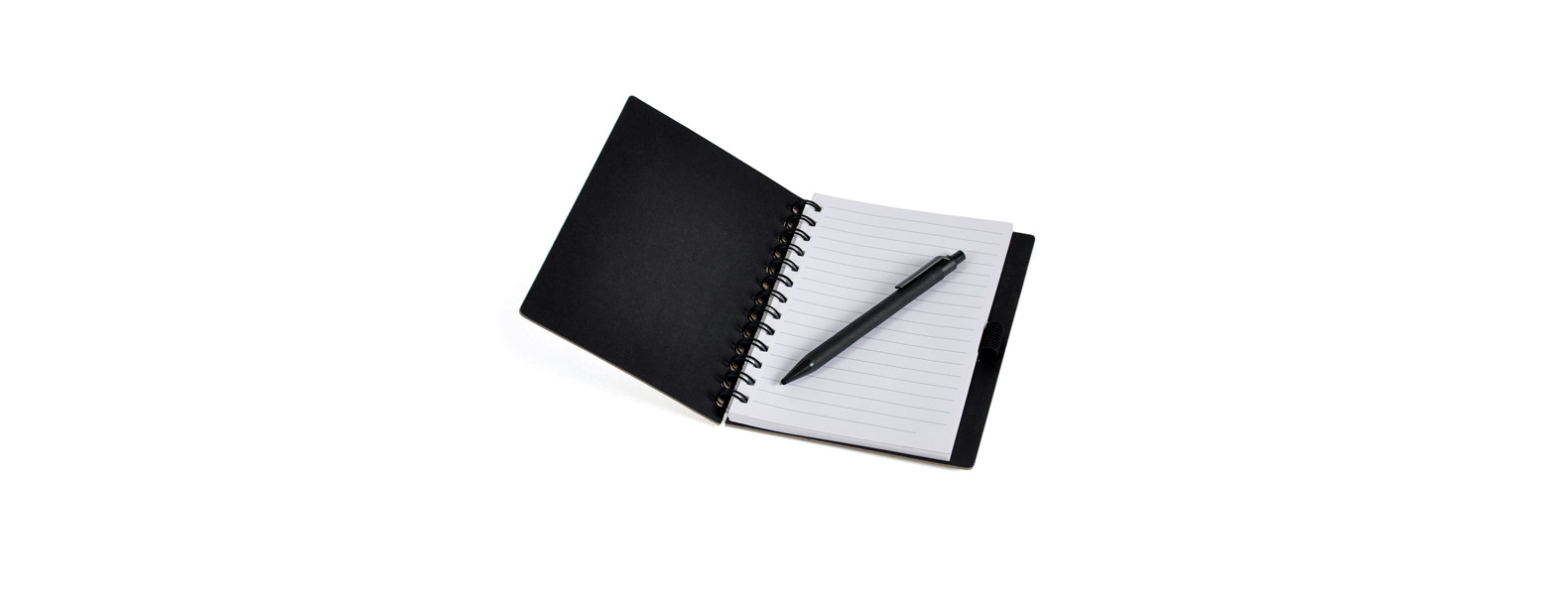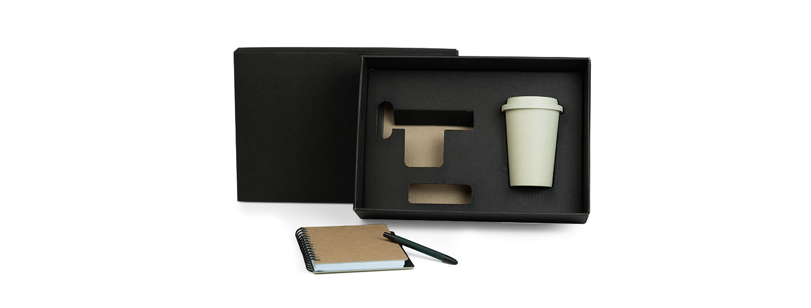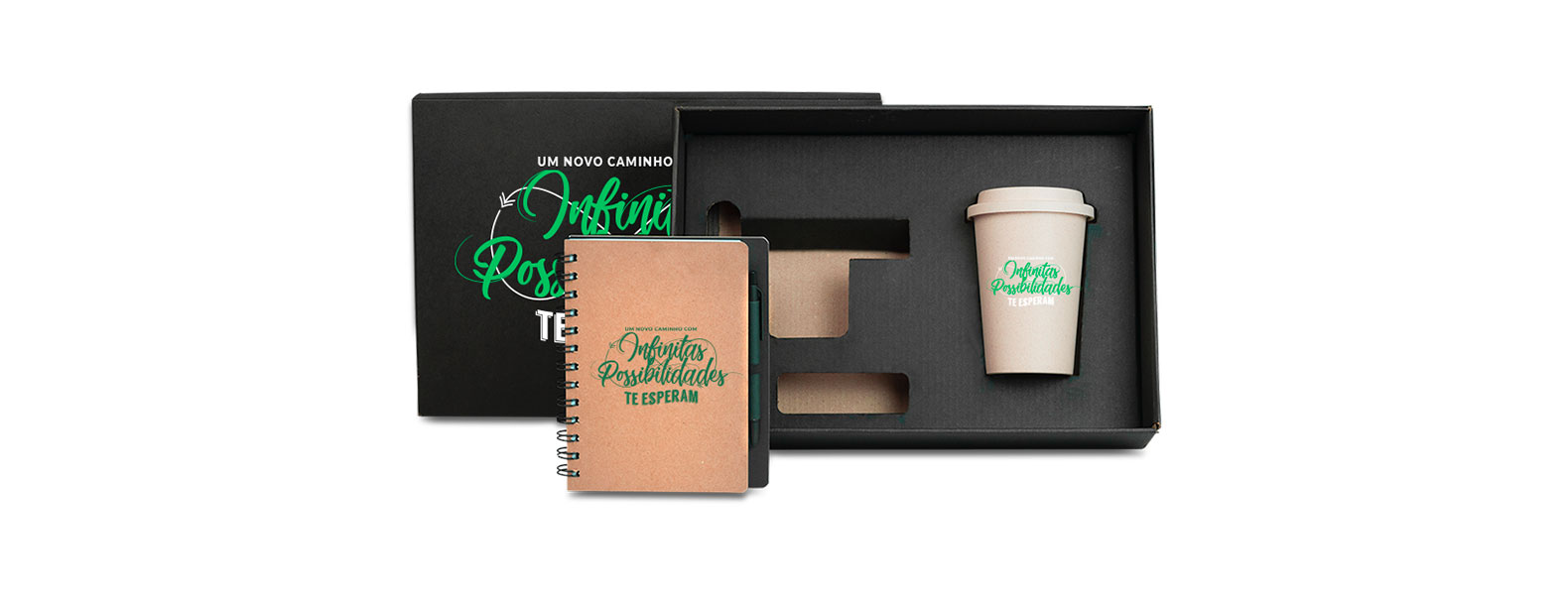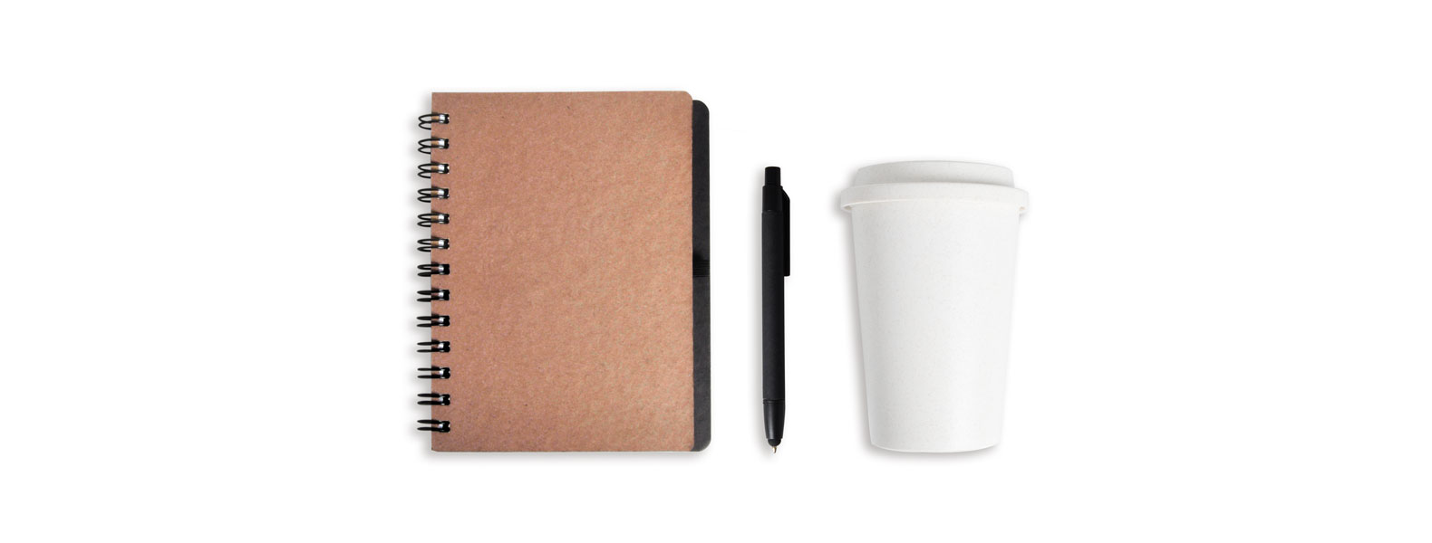 Esse kit conta com caderno com 100 folhas brancas pautadas, espiral wire-o, caneta e copo em Fibra de Bambu / PP.