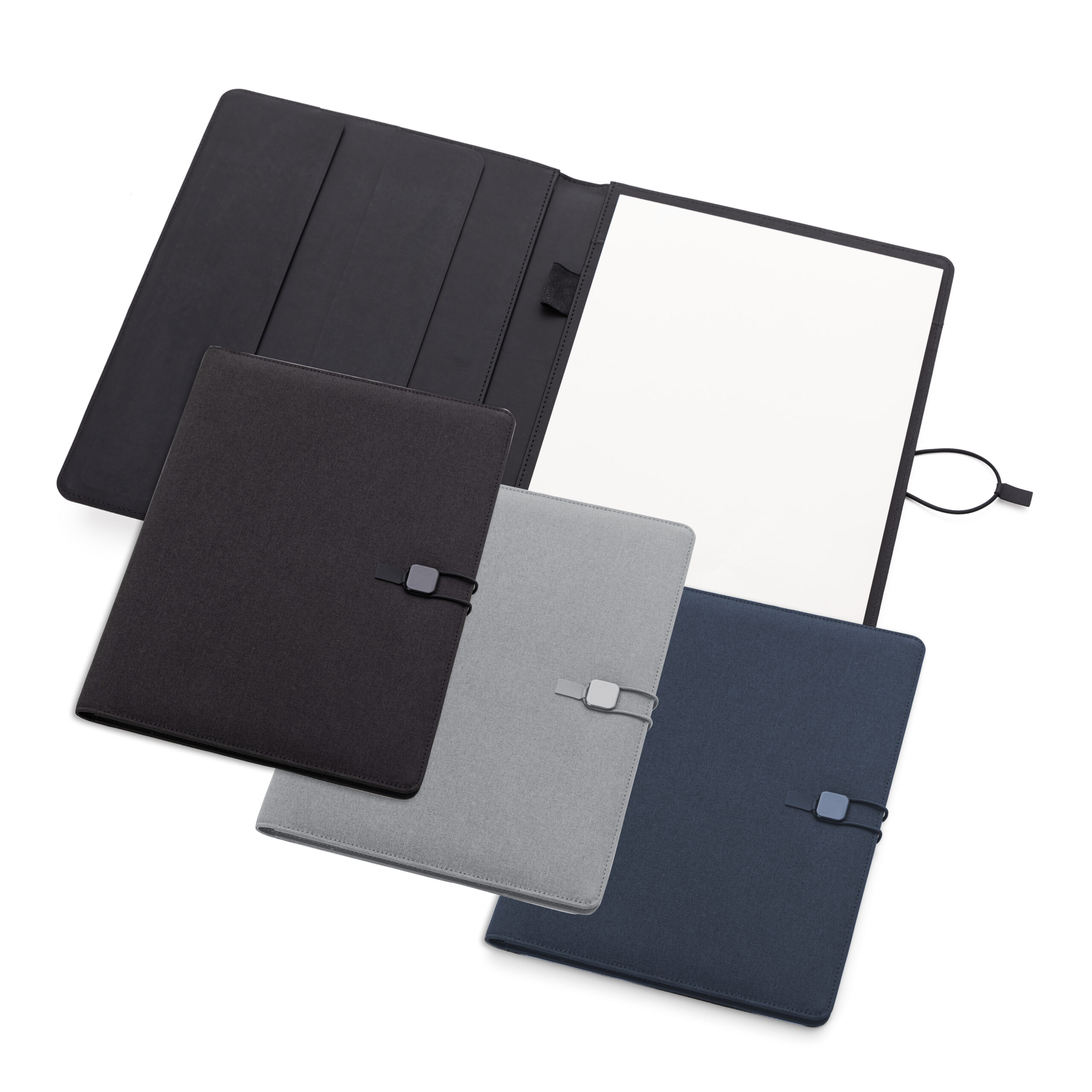 Pasta executiva com capa almofadada em tecido poliéster, contendo: Bloco de anotações com 20 folhas (Folha A4); Porta Canetas; Porta…